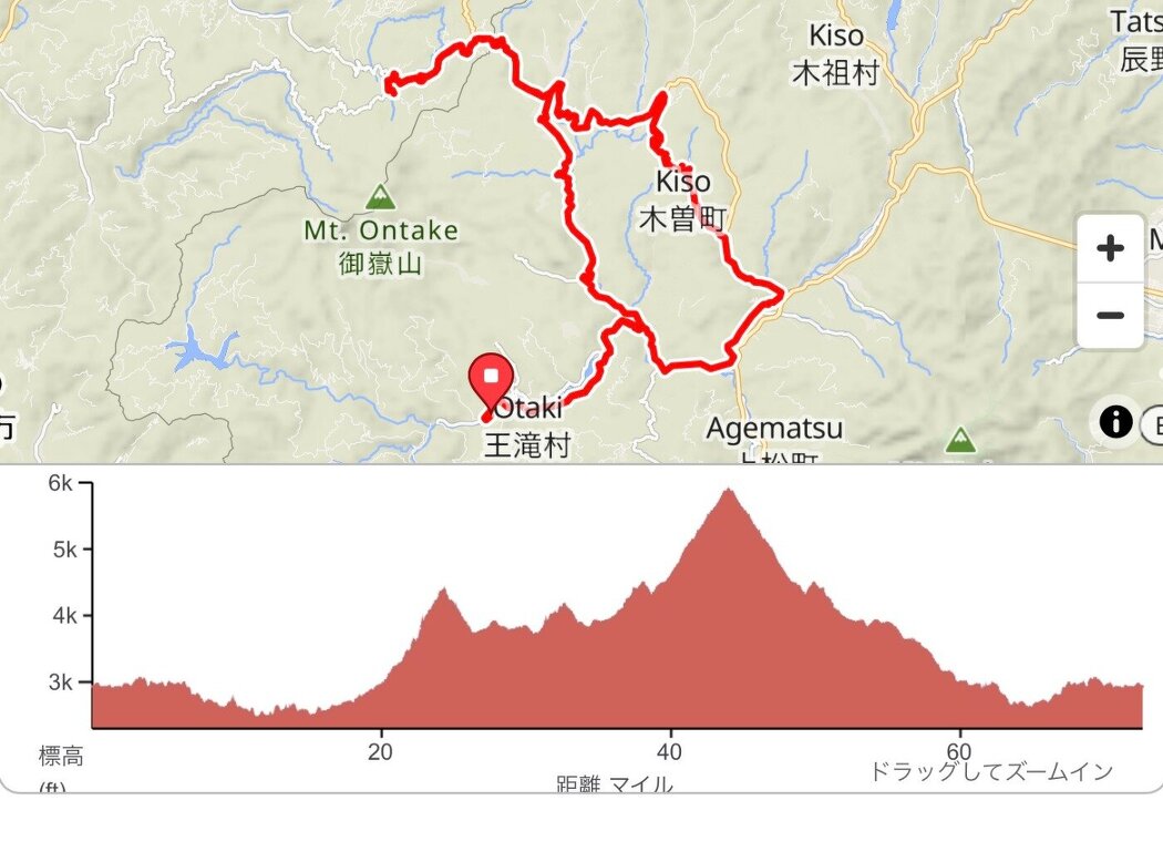 2000mを超える獲得標高は、小生には嬉しい限りなんです。地形図でご覧いただくように途中に大きな登りが二か所あります。一つ目の大きな登りは旧飛騨街道にある地蔵峠で距離9㎞で獲得標高500m登ります。二つ目は日和田ハイランド陸上競技場(1310m)から御岳チャオスキー場(1795m)までの9㎞。